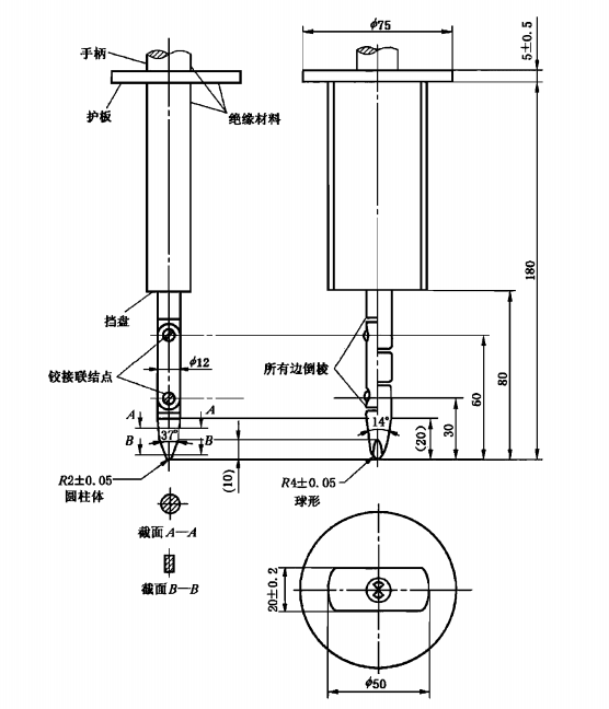 能方便地模仿人體的一部分或模仿工具或類似物,由人手持著來檢驗距離危險部件是否有足夠間隙的檢驗工具。